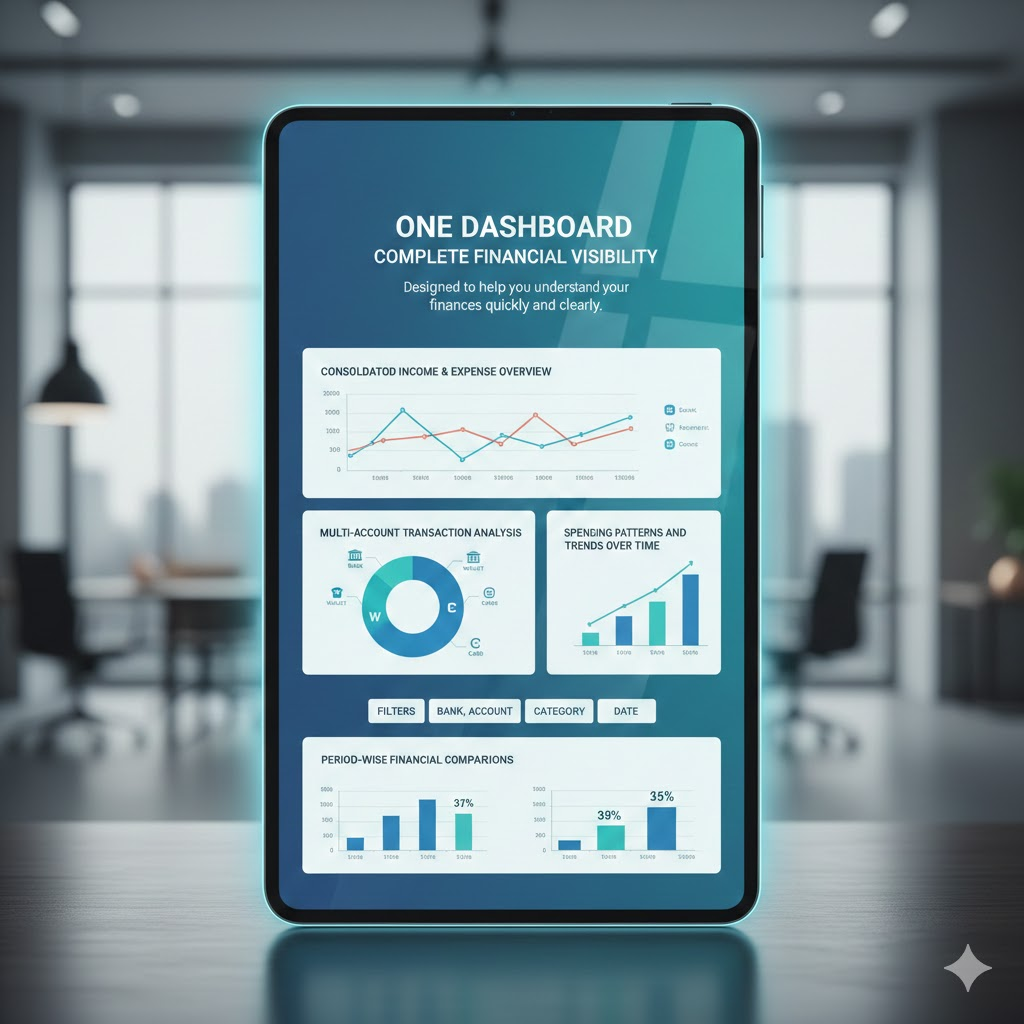 Use powerful filters to view all accounts together, focus on specific banks, or analyze by date range or category. The dashboard updates instantly.